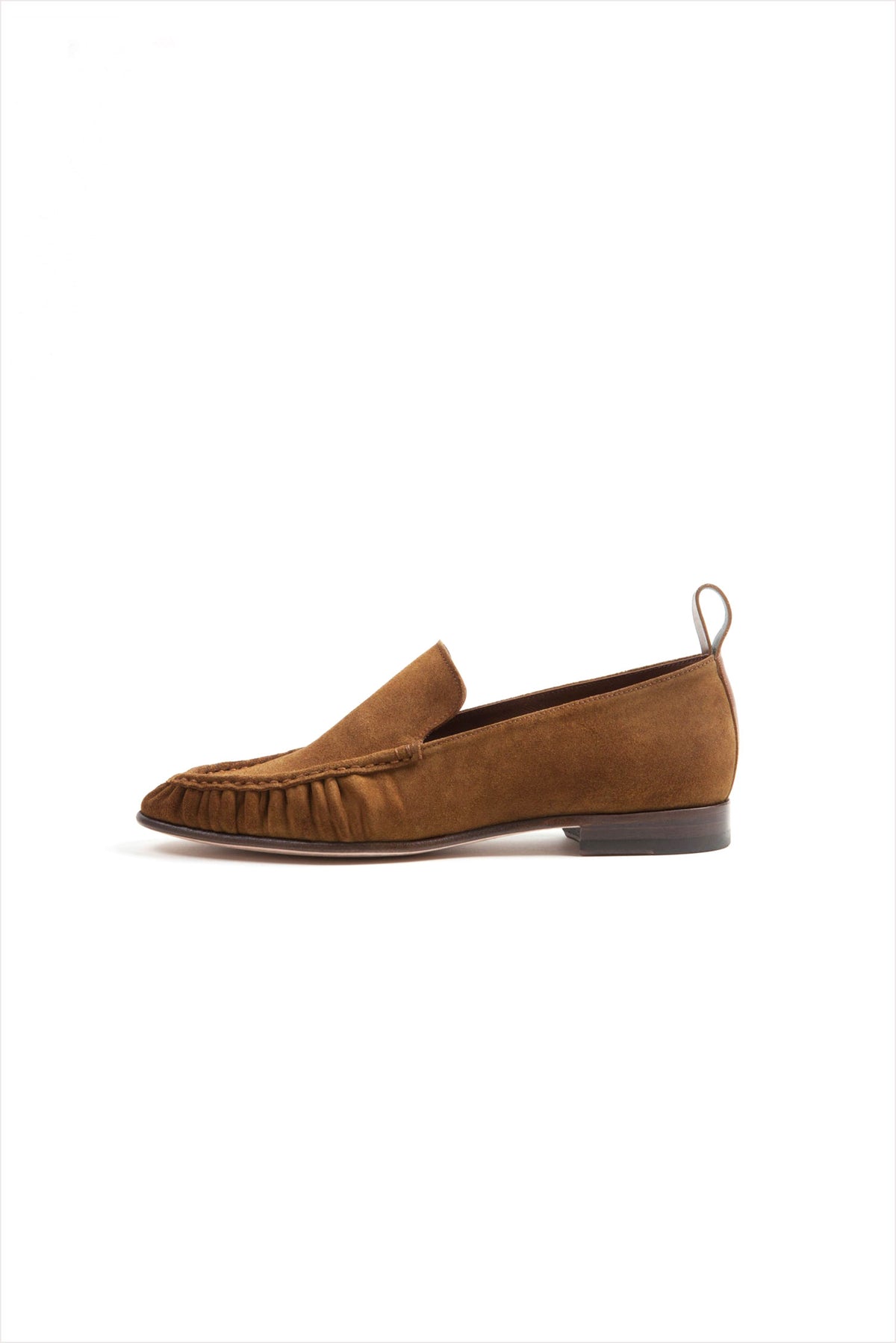 Suede Brown 100% natural calfskin handcrafted loafers with round moc toe. Tonal leather trim at vamp and tonal pull-loop at collar featuring the brand's logo.