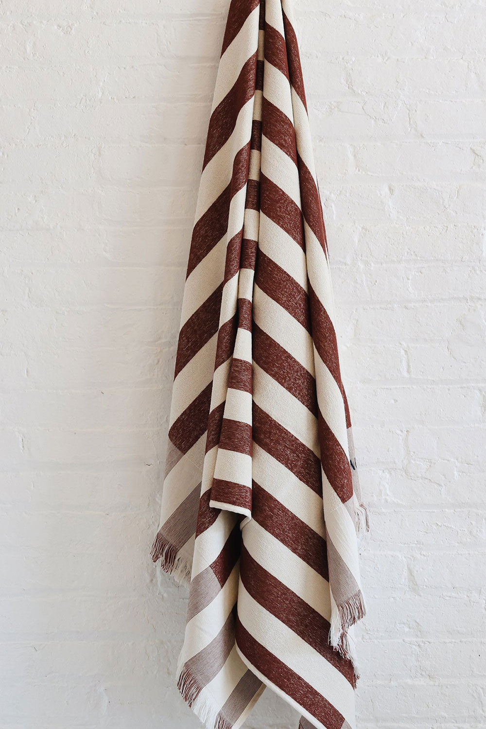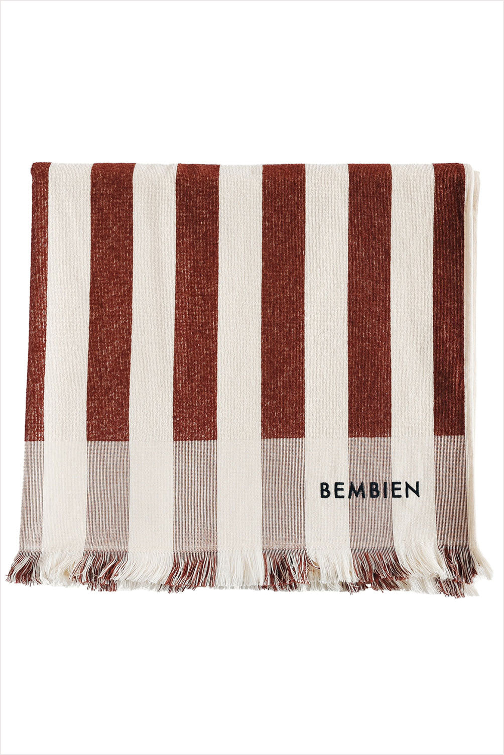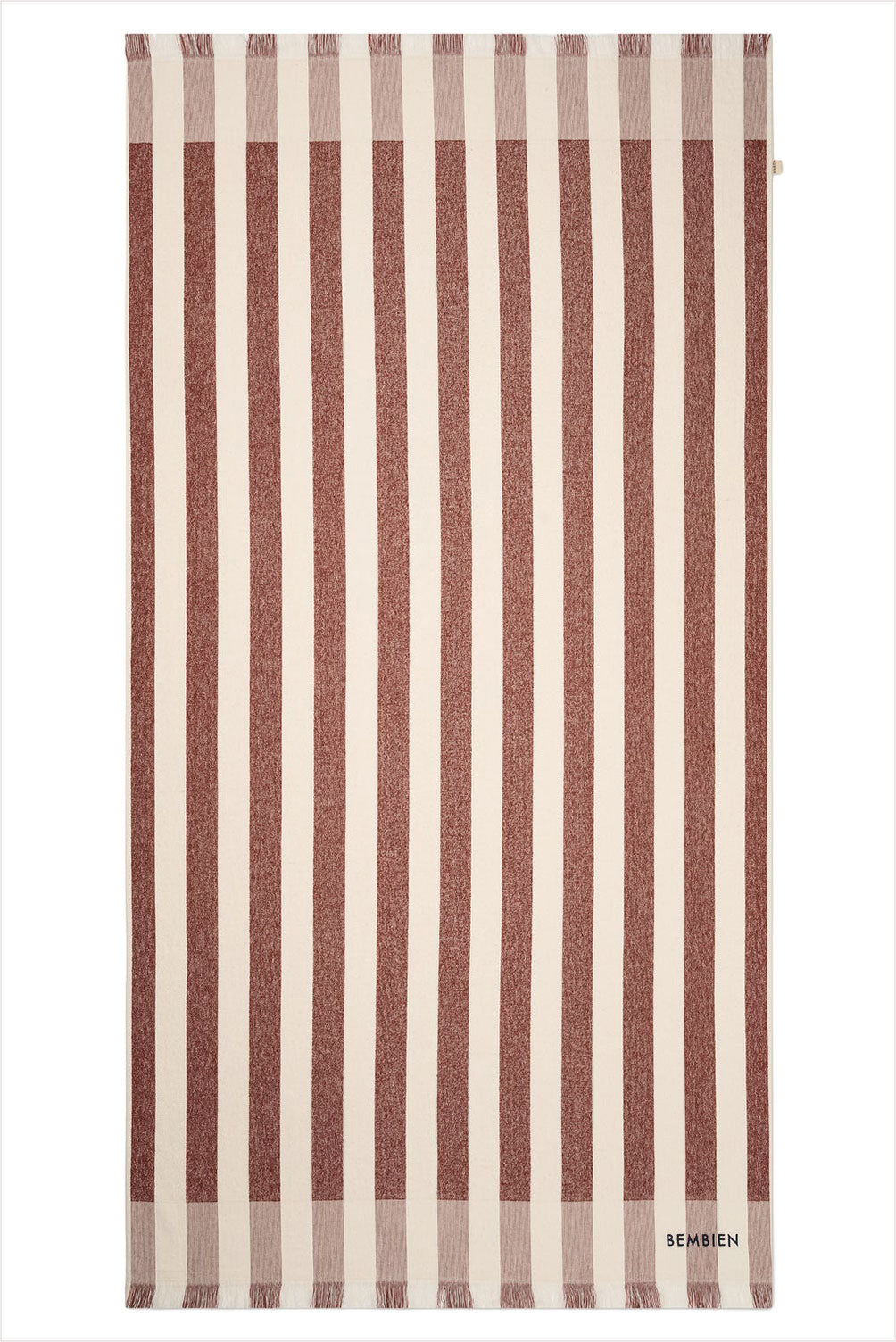Large, super soft beach towel. Striped with fringed edges, inspired by 1950s Italian beach resorts. Made in a small, family-owned textile studio in Portugal from 100% organic cotton.