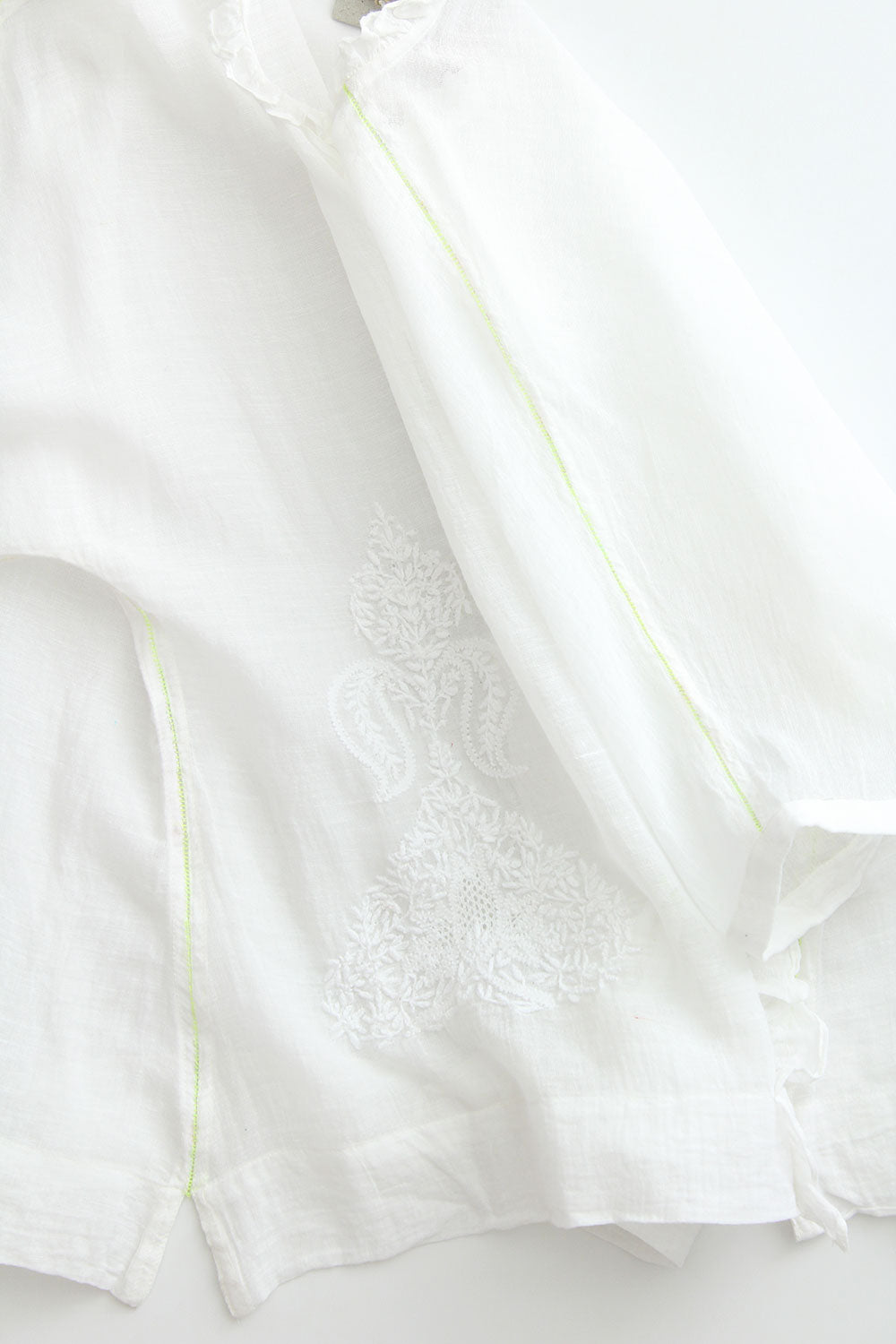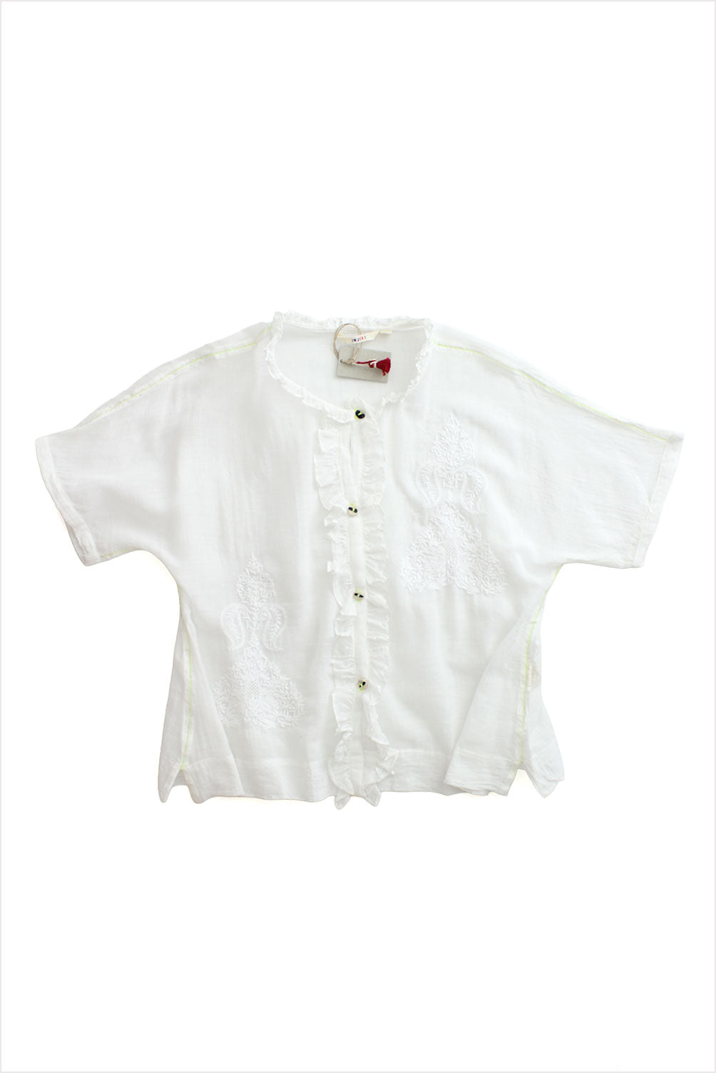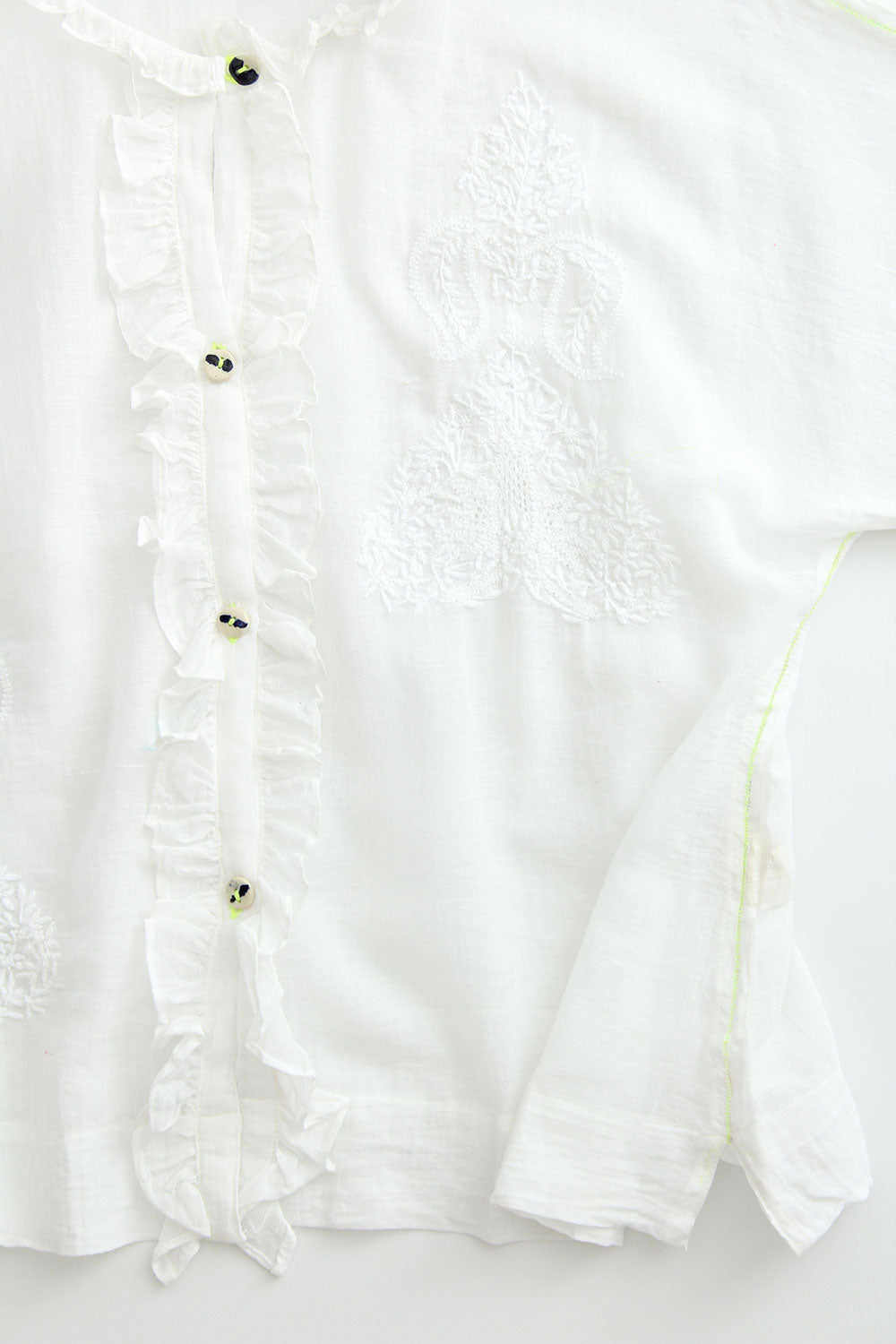 ruffles at collar and button placet