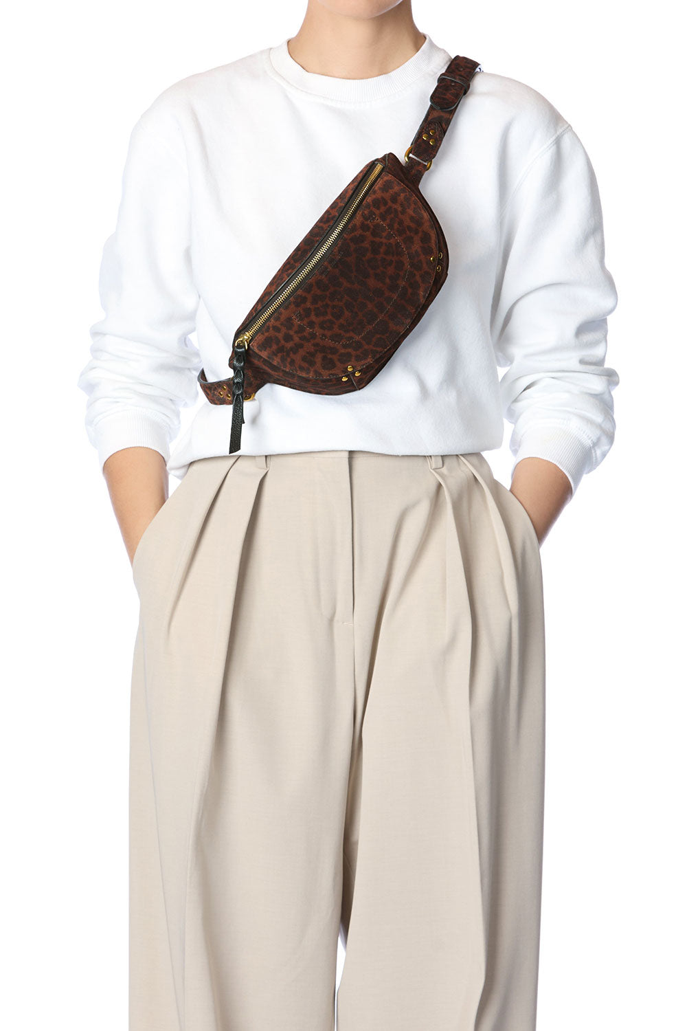Zipper closure on the top of the bag. An adjustable belt, measuring a maximum of 103 cm. One inside patch pocket. One exterior zippered pocket.
