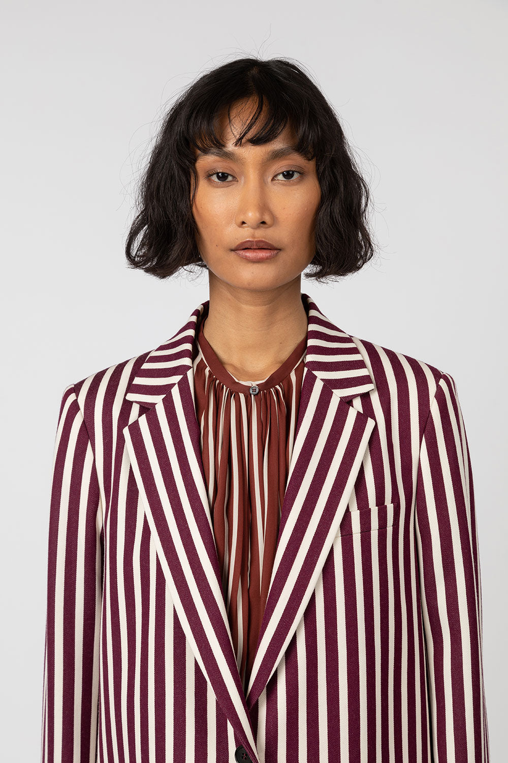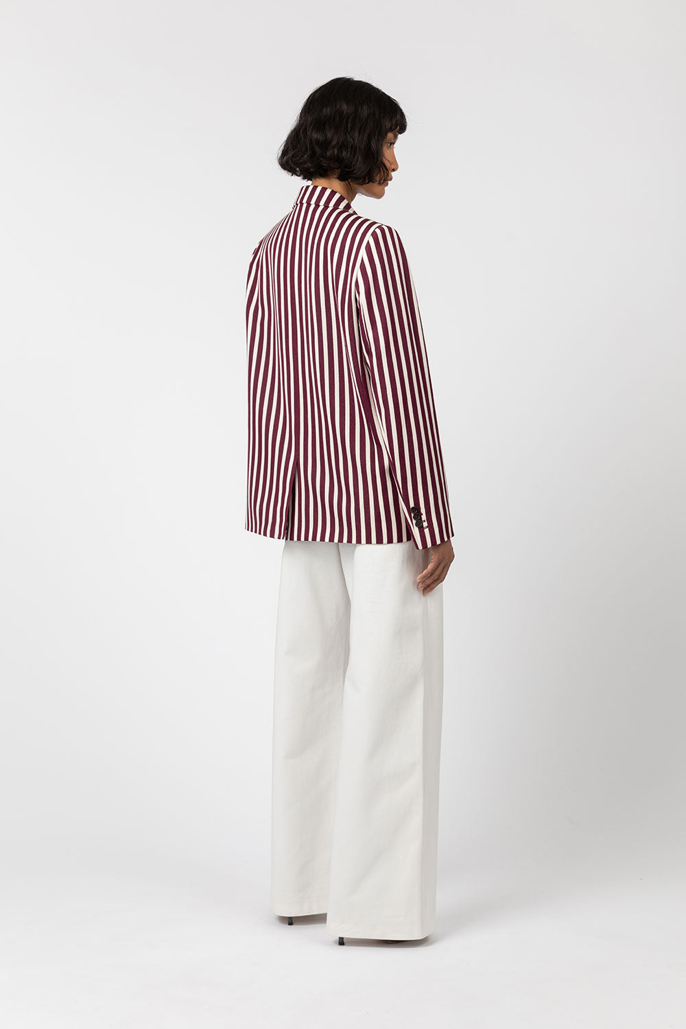 This blazer is made from a supple and soft “Venetian” woven wool in Yorkshire in England. The stripes are carefully positioned to create a graphic look. The cut is straight and elongated. The blazer is fully lined and closes with horn buttons which also adorn the sleeves.