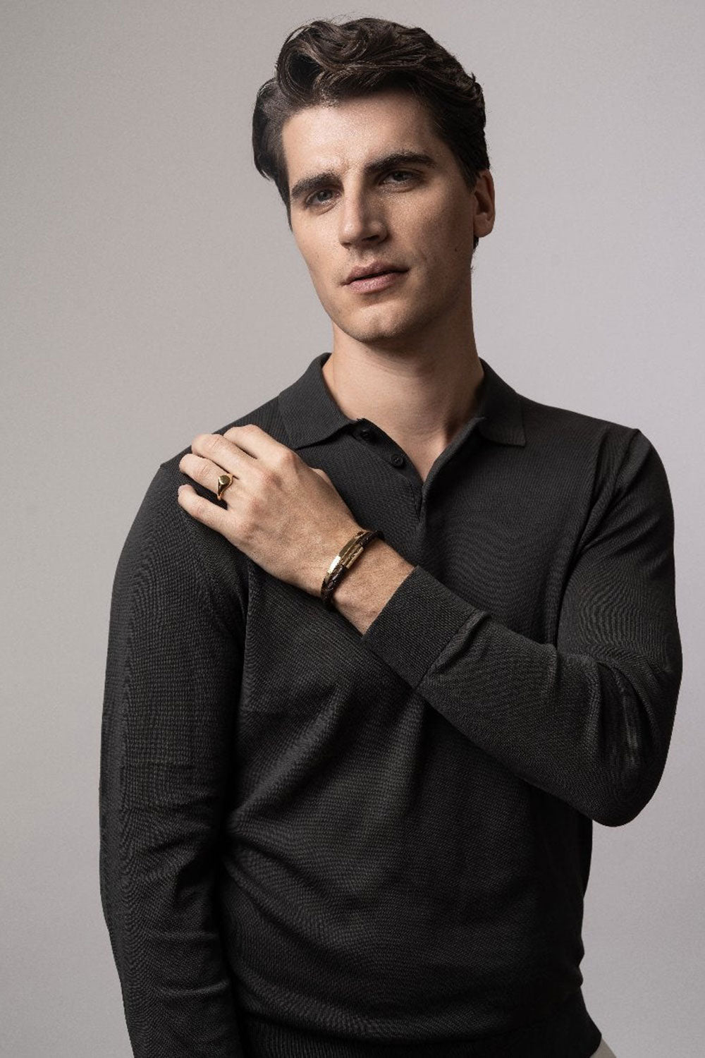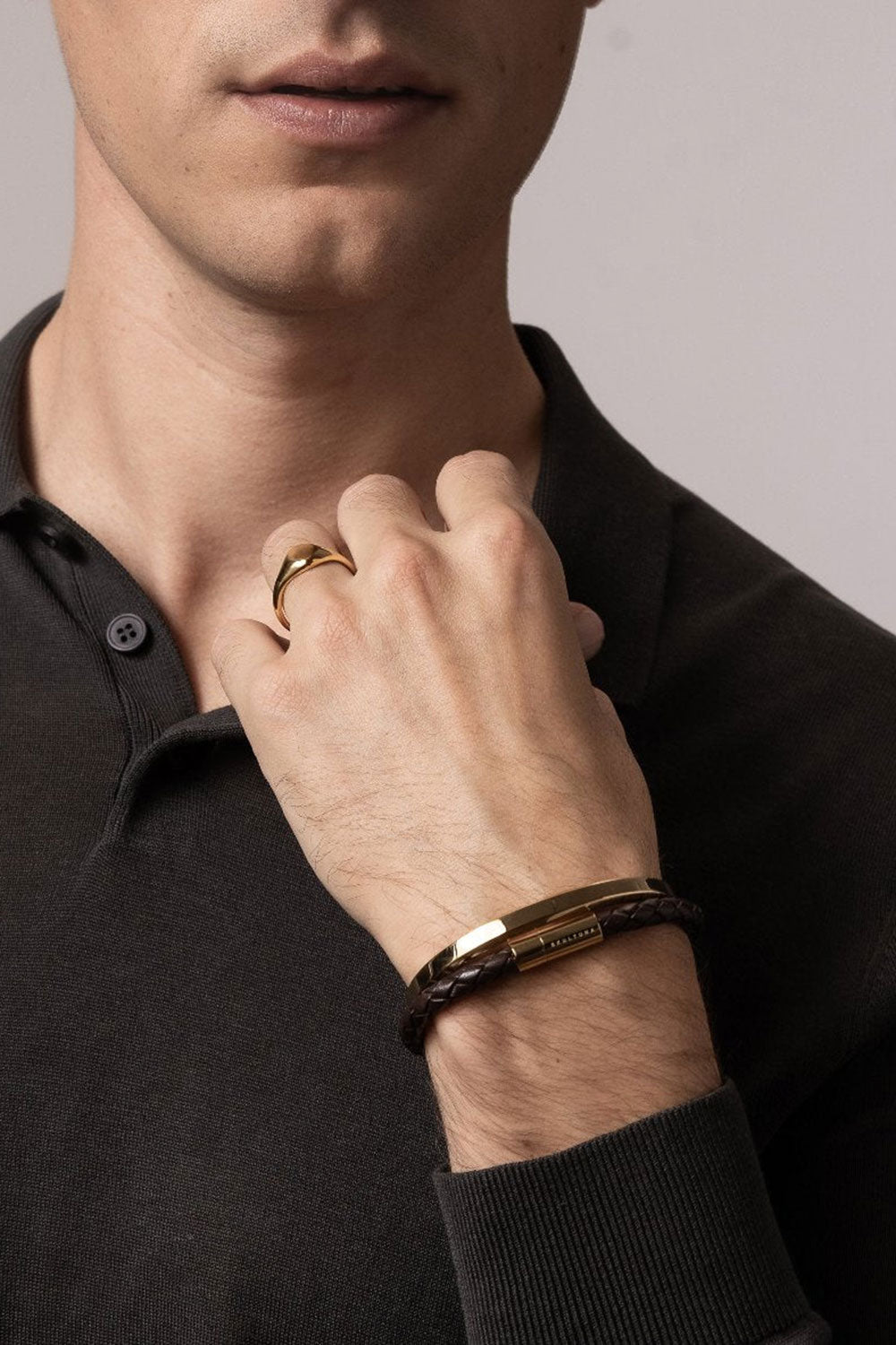 A stylish bracelet with braided leather and engraved clasp. The clasp has a double-lock mechanism to secure the wearer when putting on and using the bracelet