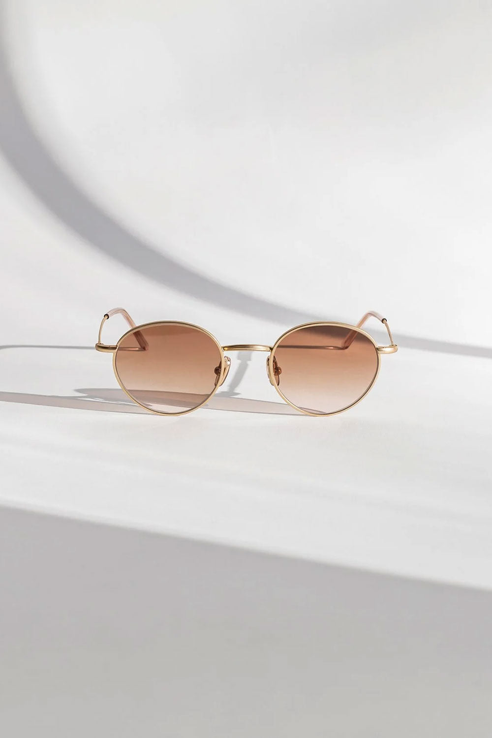 Matte gold finish with temple tips dipped in rose acetate. Gradient hazel to strawberry lens. Nose pad features subtle Masaki logo in gold.