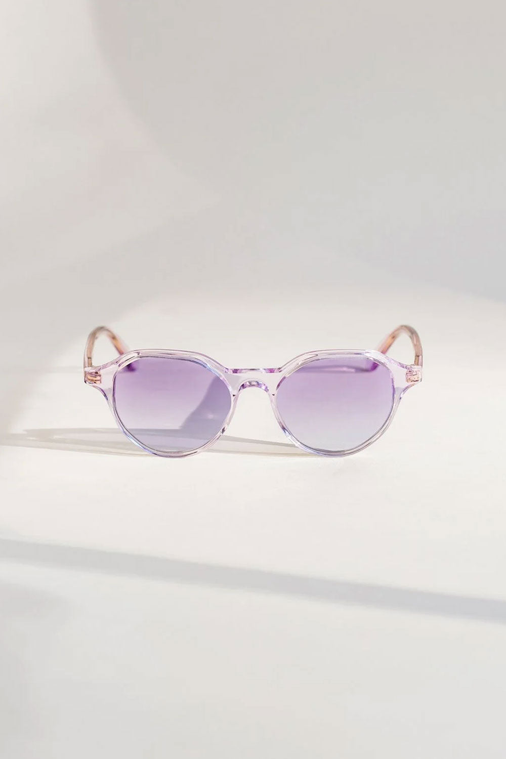 Translucent lavender frame with lavender to sky gradient lens. A balanced combination of purple hues, uplifting on a cloudy day. A paean to the magical quality of water, the shade is reminiscent of Eva's days living along the Nagara river in Gifu, Japan: windows open, listening to the sound of the river rushing down from the alps until the snow fell. An iconic frame for the brand where both purple and water take center stage.