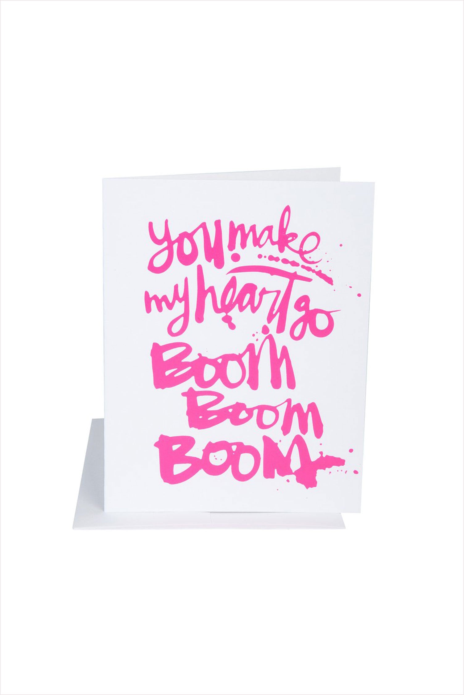 Greeting: "You Make My Heart Go Boom Boom Boom" (Blank Inside)Printing: Matte Hot Pink FoilCard size: 5.5" x 4.25", FoldedPaper: thick colored stock with coordinating A2 envelope