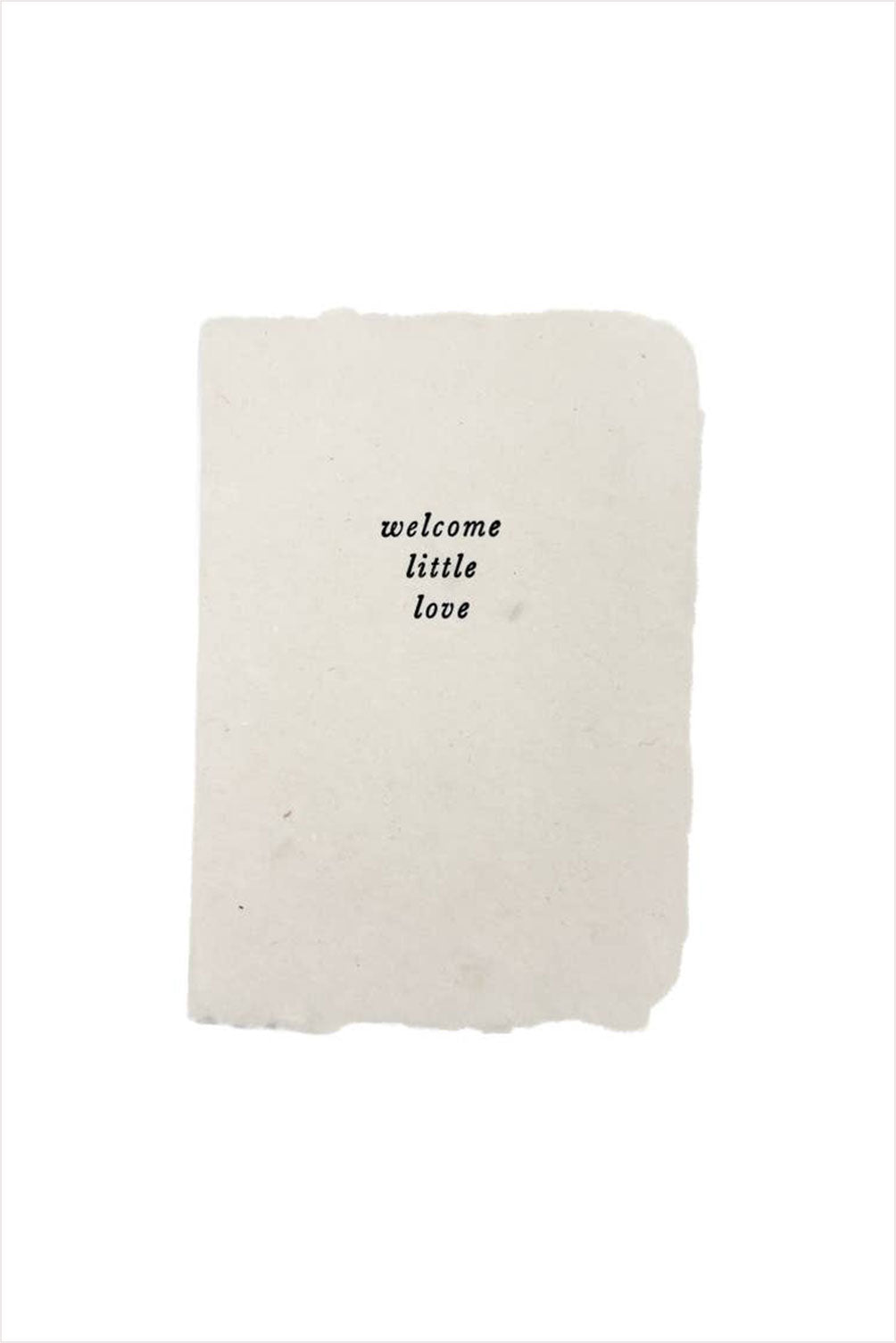 Card reads "welcome little love". Vanilla handmade paper with black letterpress ink.
