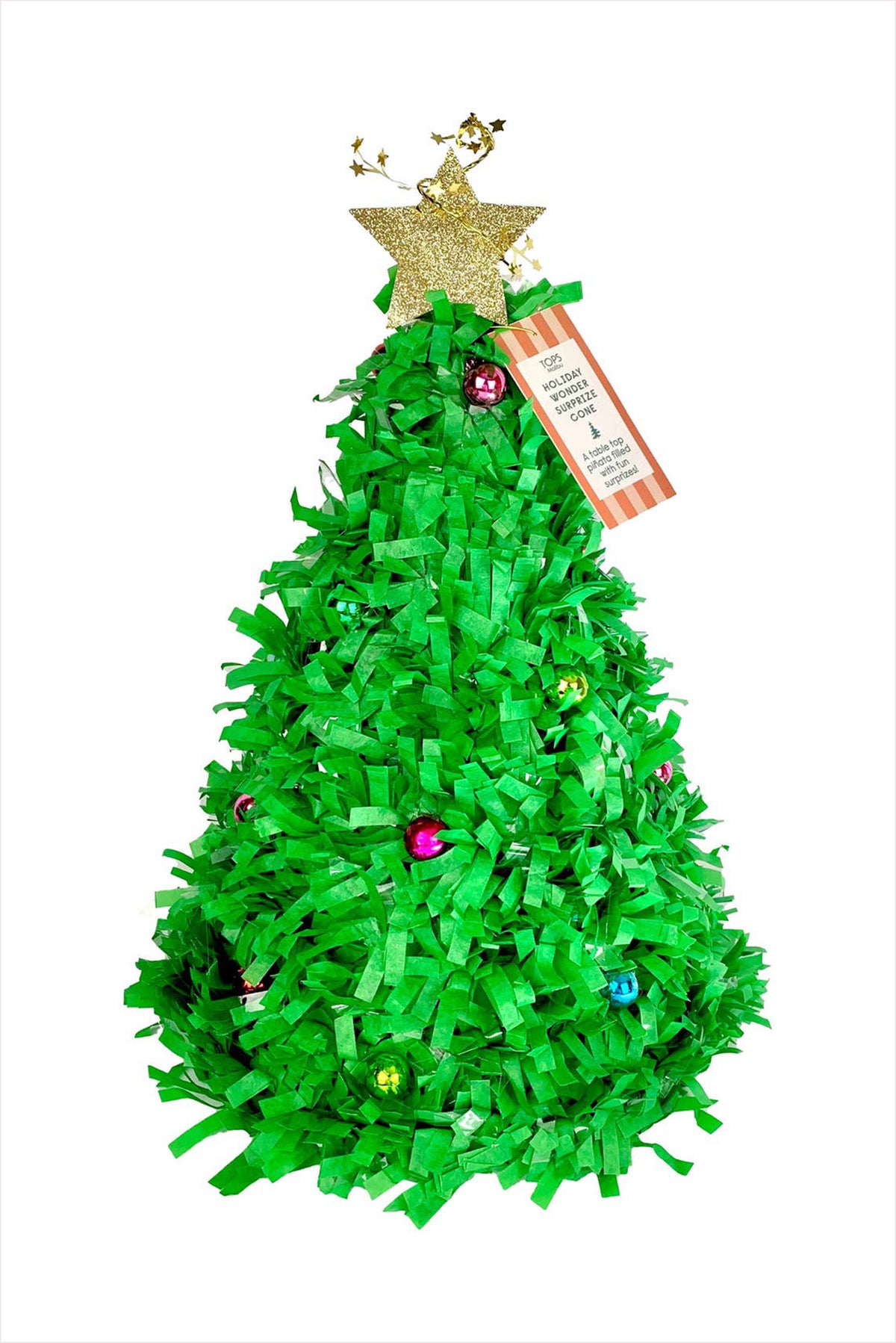 Bring the holiday cheer to your next event with our 13" Holiday Wonder Cone Tree Piñata. Adorned with a gold glitter star and multicolored ornaments. Feature on your holiday table or give as a gift!! 25 hidden prizes inside. Prizes vary & may include: vintage style toy, game, gemstone, crystal, sweet, crown, festive tattoo, good fortune, riddle in the middle and more!