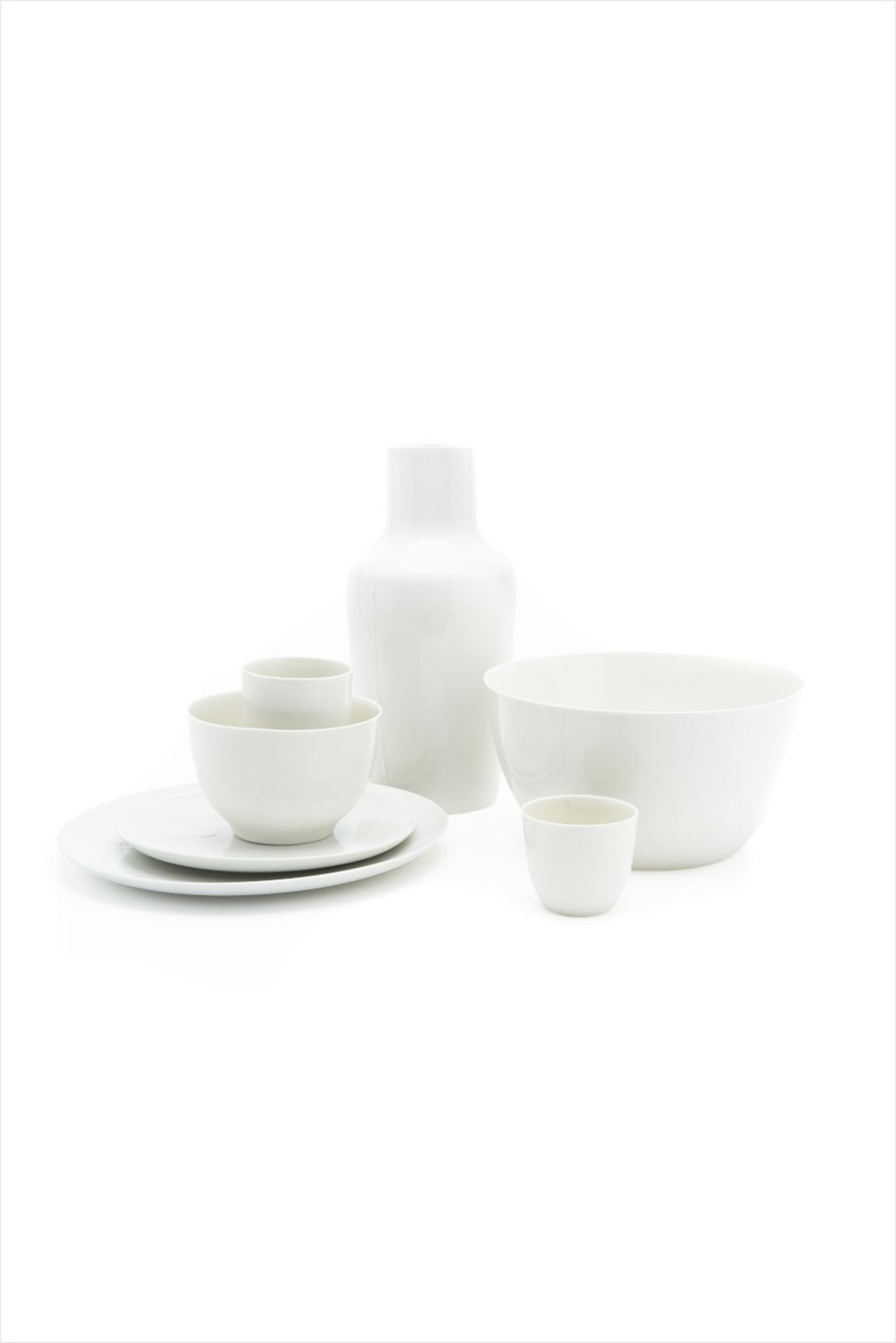 the B-set is conspicuous for plates that can barely be stacked orderly, dishes that are not quite circular and mugs of varying thickness. Slight deviations come unavoidable with the deliberately chosen production process. Each piece is fired in an overheated kiln to slightly warp the porcelain into uniquely distorted shapes and coincidental material effects. The imperfections give each piece of this dinnerware a unique character. The B-set by Hella Jongerius is generally considered to be an icon in the history of Dutch design.