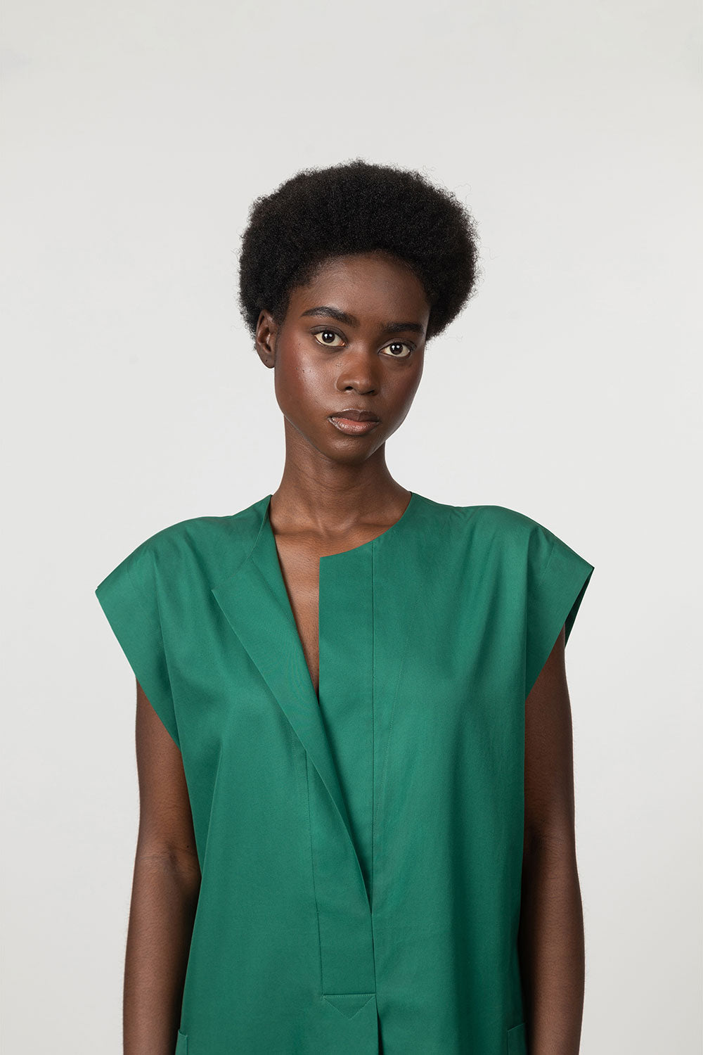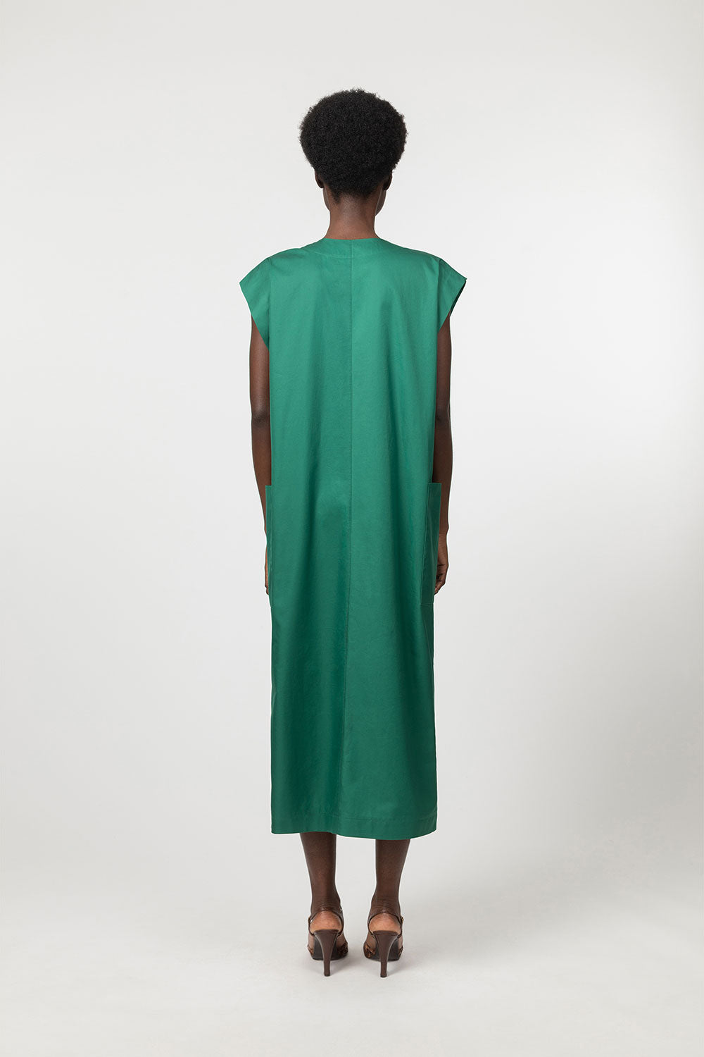 This staple dress from the collection is made from a cotton satin woven in Italy by Borghi, a mill founded in 1819. The silhouette is enhanced by deep patch pockets sewn on either hip and an elegant concealed button placket at the chest. The kimono armholes and side slits with interior trim add a feminine touch to this graphic look. A belt is provided if you wish to highlight your waist.