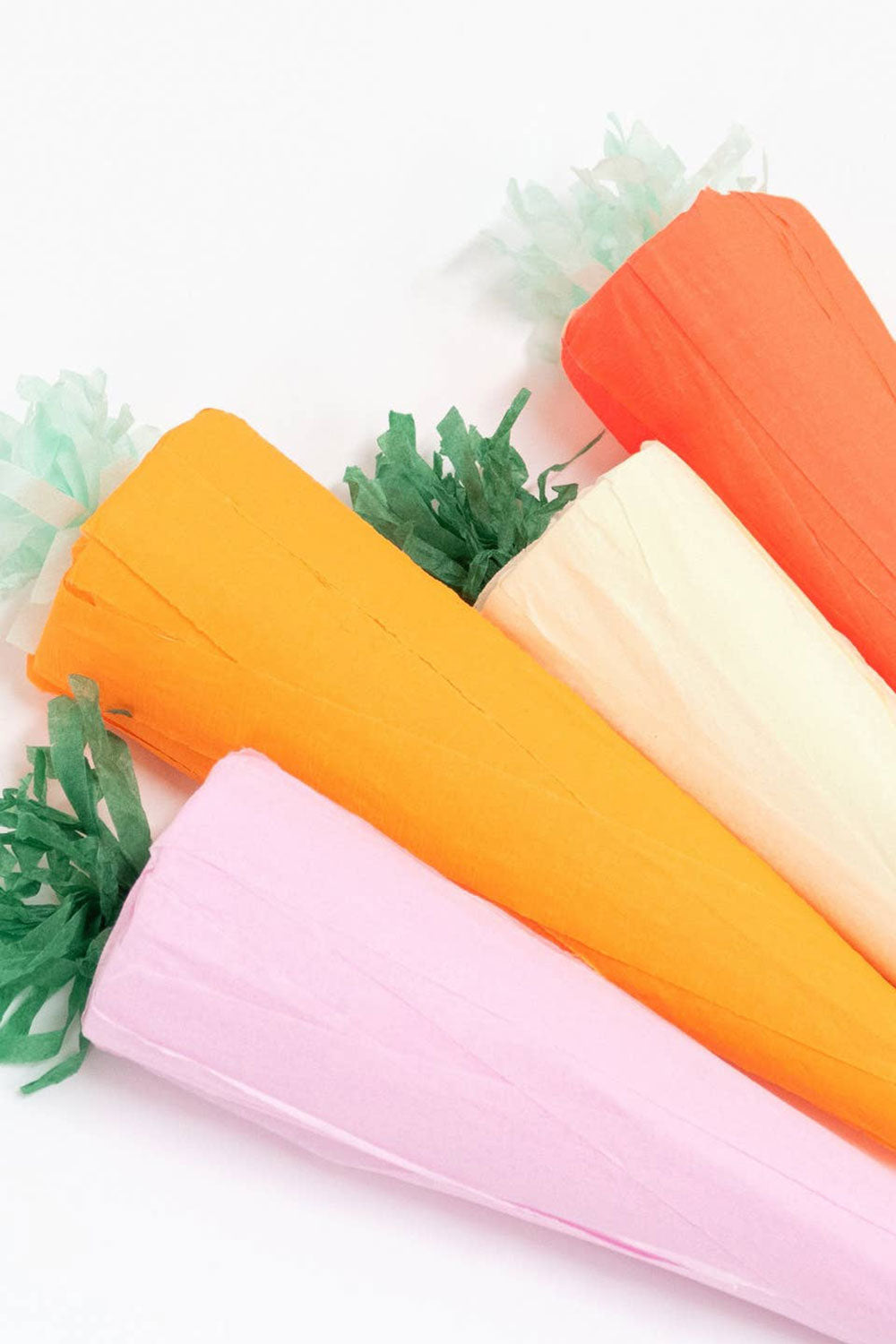 If you're looking for excellent Easter party ideas, look no further than our brilliant take on the traditional 'surprise ball' idea - surprise carrots! Each pack contains four carrots in four colors, each wrapped in crepe paper.