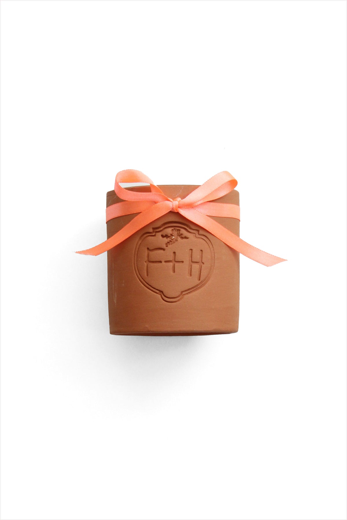 Terra-cotta candle urn hand printed in Morocco, featuring our hand-drawn crest.