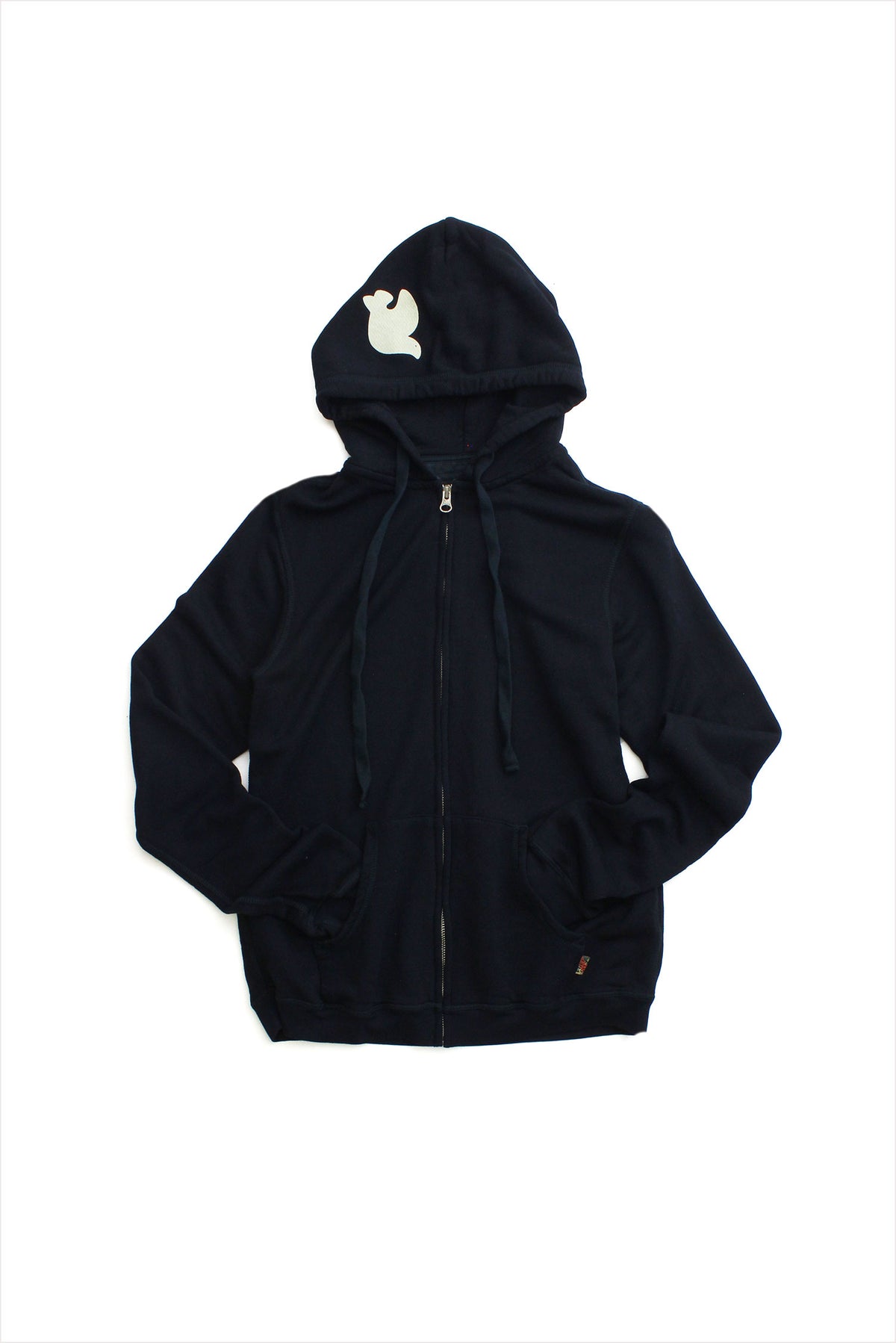 A super-comfy deep blue zip hoodie, featuring the classic cream FREECITY dove graphic on the hood. This unisex style is a great staple addition to a cool, cozy wardrobe. All handmade, hand-printed, and all FREECITY!