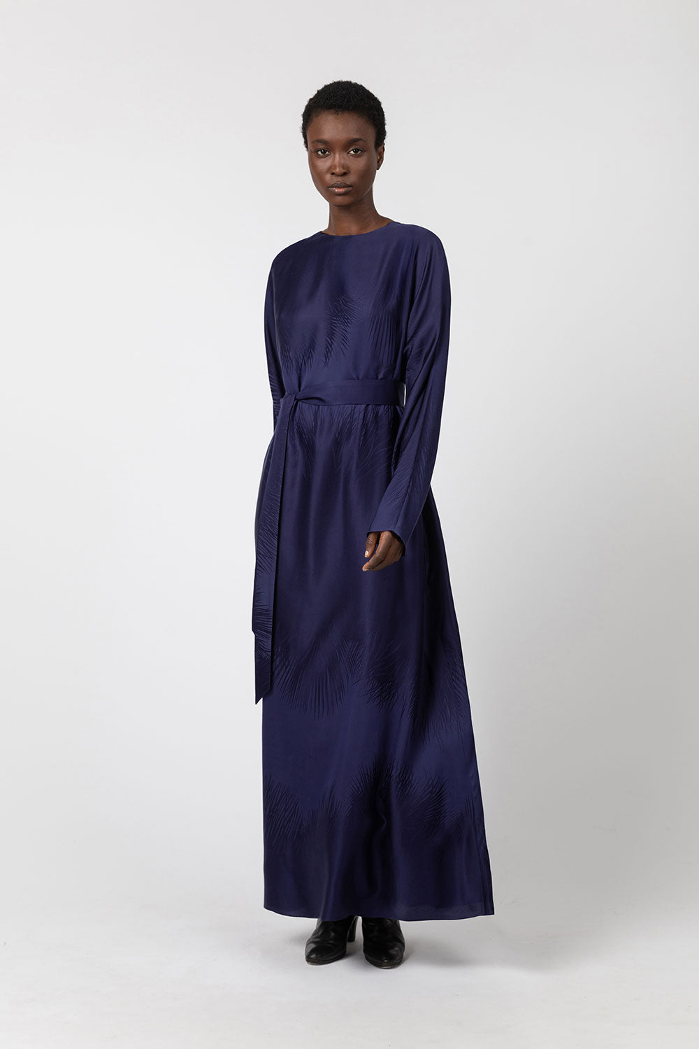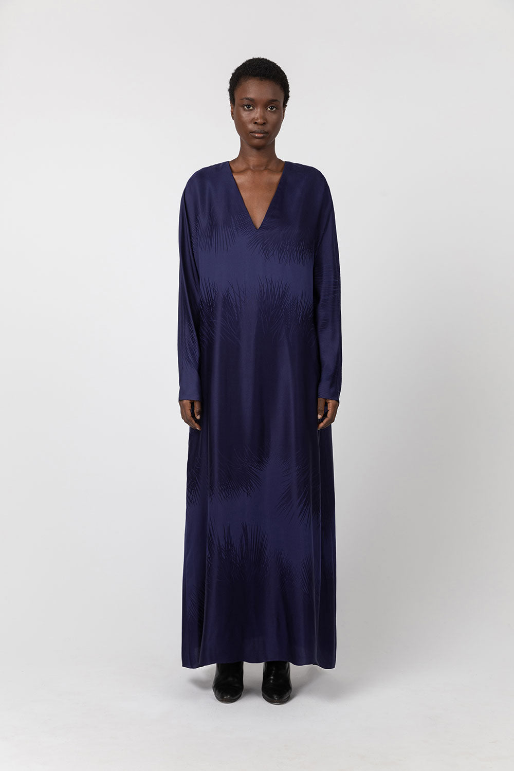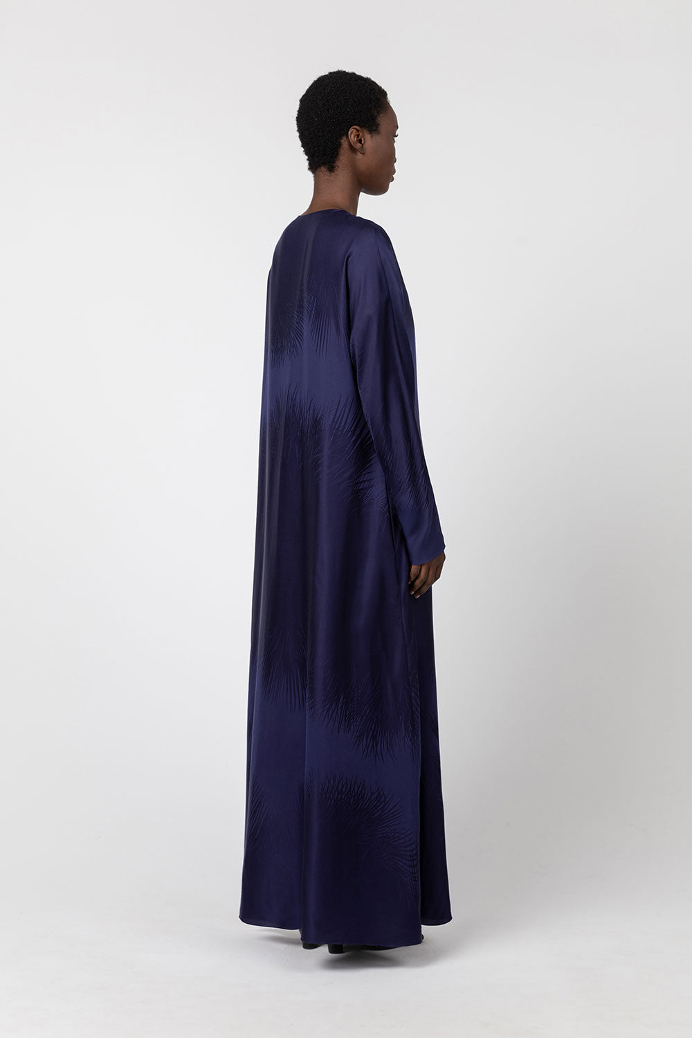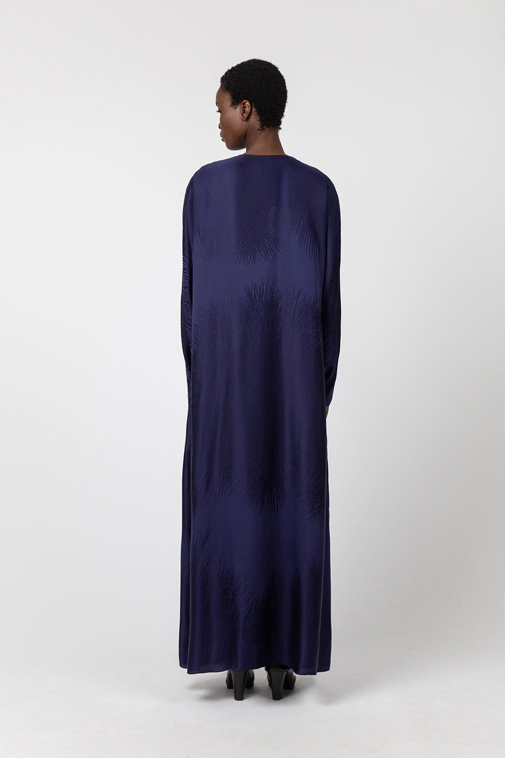 This reversible kimono dress is made from a viscose and silk jacquard woven near the French Alps at Les Tissages Perrin, exclusively for INDRESS. The infinite palm tree pattern, designed by Wies Schulte, adds a twist to the piece. Each dress is unique. The dress can be worn with either the V-neck or the round neck in front. The dress is sold with a thick belt if you wish to highlight your waist.