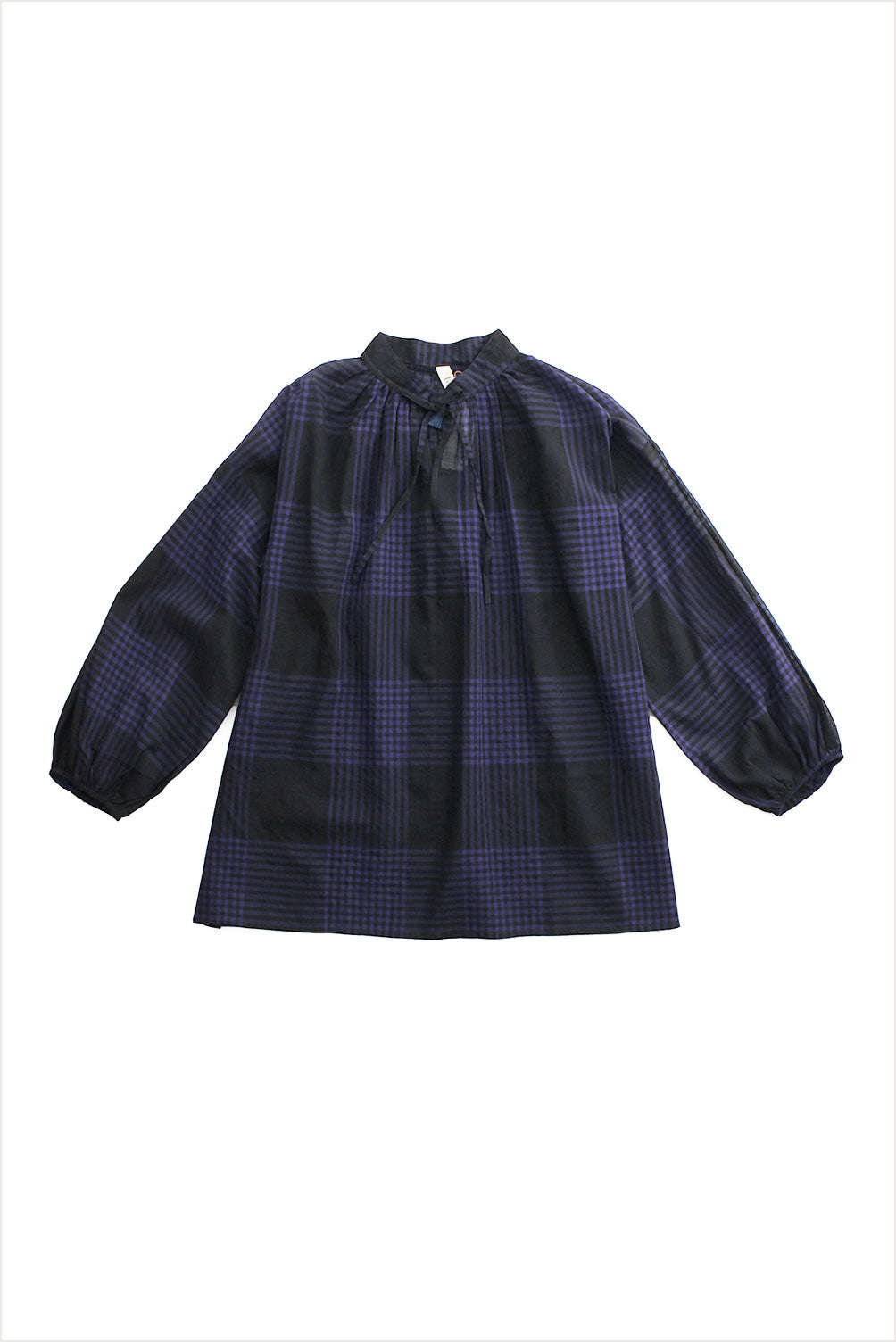 A sheer gorgeous tie top in soft khadi cotton with slight puff sleeve. Easy to layer and so very chic! Tuck it in or wear it out. Can be worn tied at neck as pictured or loose. A modern, streamlined take on the peasant shirt. Sheer handwoven fabric with a black base and electric blue lines.