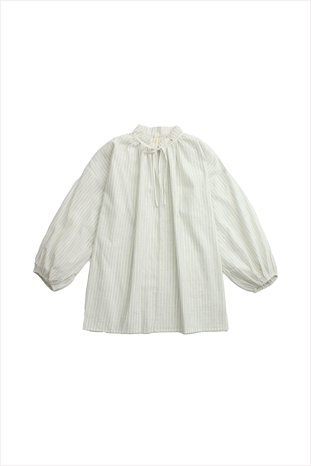 A gorgeous tie top in soft khadi cotton with slight puff sleeve. A favorite piece. Easy to layer and so very chic! Tuck it in or wear it out. Can be worn tied at neck or loose as pictured. A modern, streamlined take on the peasant shirt.