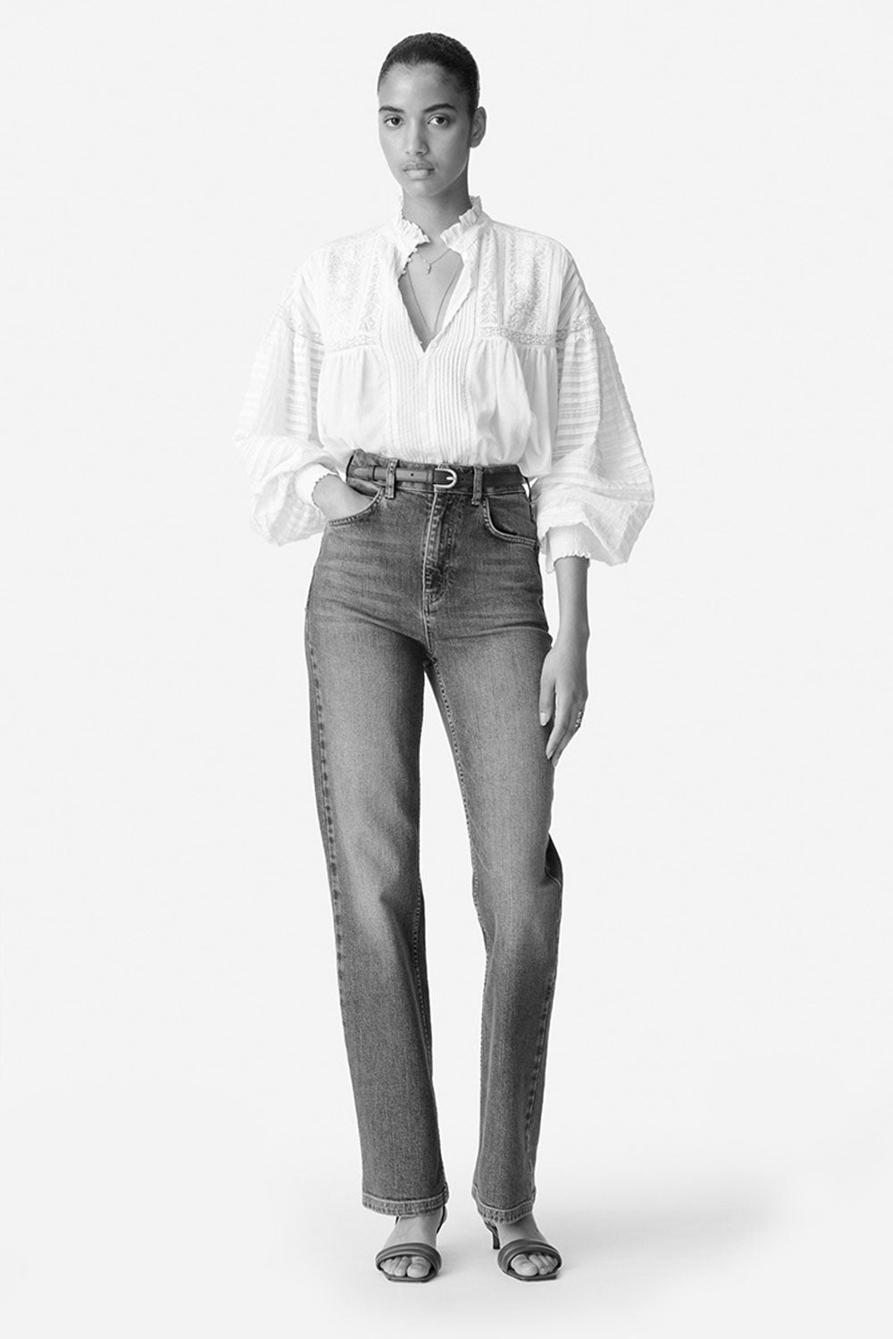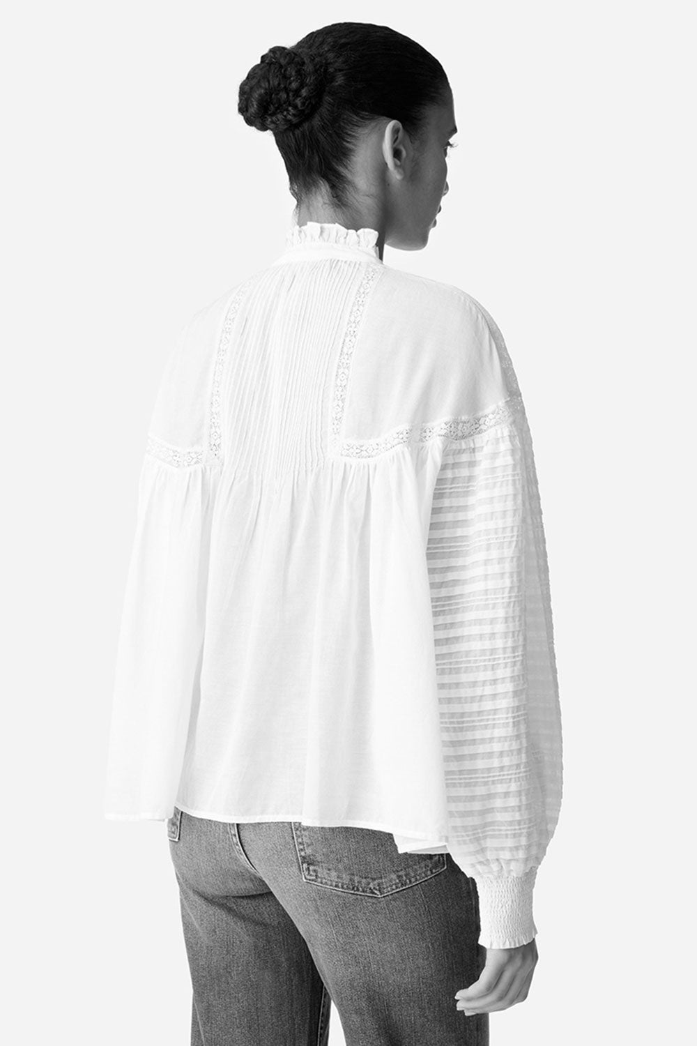 The vintage-look Dahlia cotton-blend blouse stands out for its meticulous, neat details. Featuring a range of pleating techniques, embroidery, gathers and lace, this piece is already a wardrobe favourite. Its cropped, trapeze cut creates a dainty, airy, foamy look. The added extra? The smocked, elasticated style of the sleeves let you play with the silhouette and the volume of these puffed sleeves.