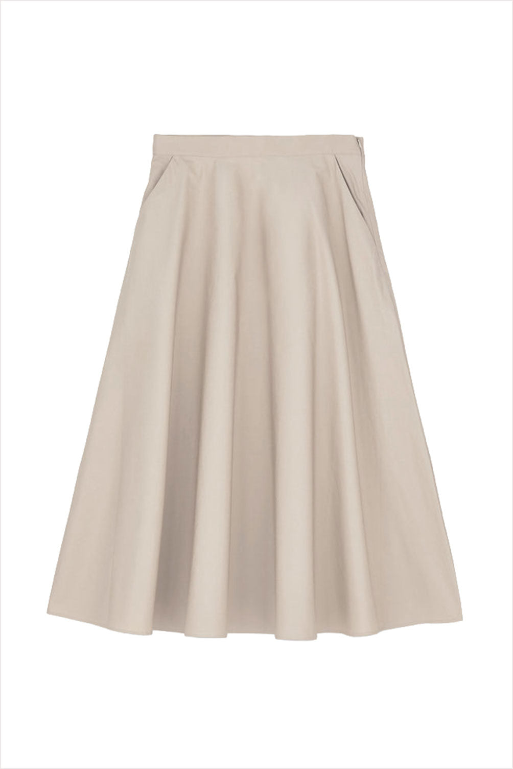 A timeless, midi skirt made from soft, regenerative organic cotton. Designed with a fitted waist, a discreet zip closure, and a gentle A-line silhouette. The detailed angled pocket seams create an elegant, draped look.