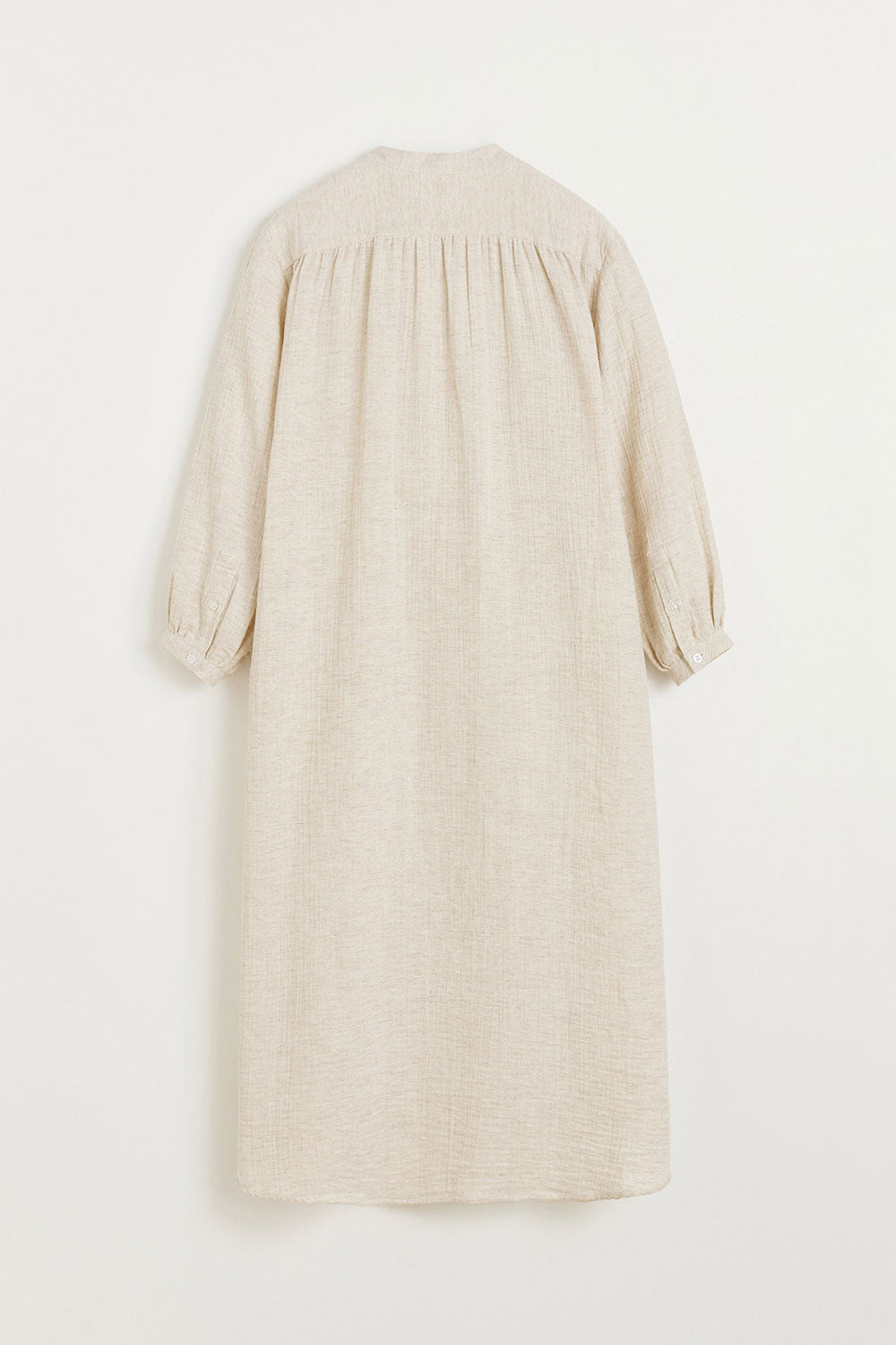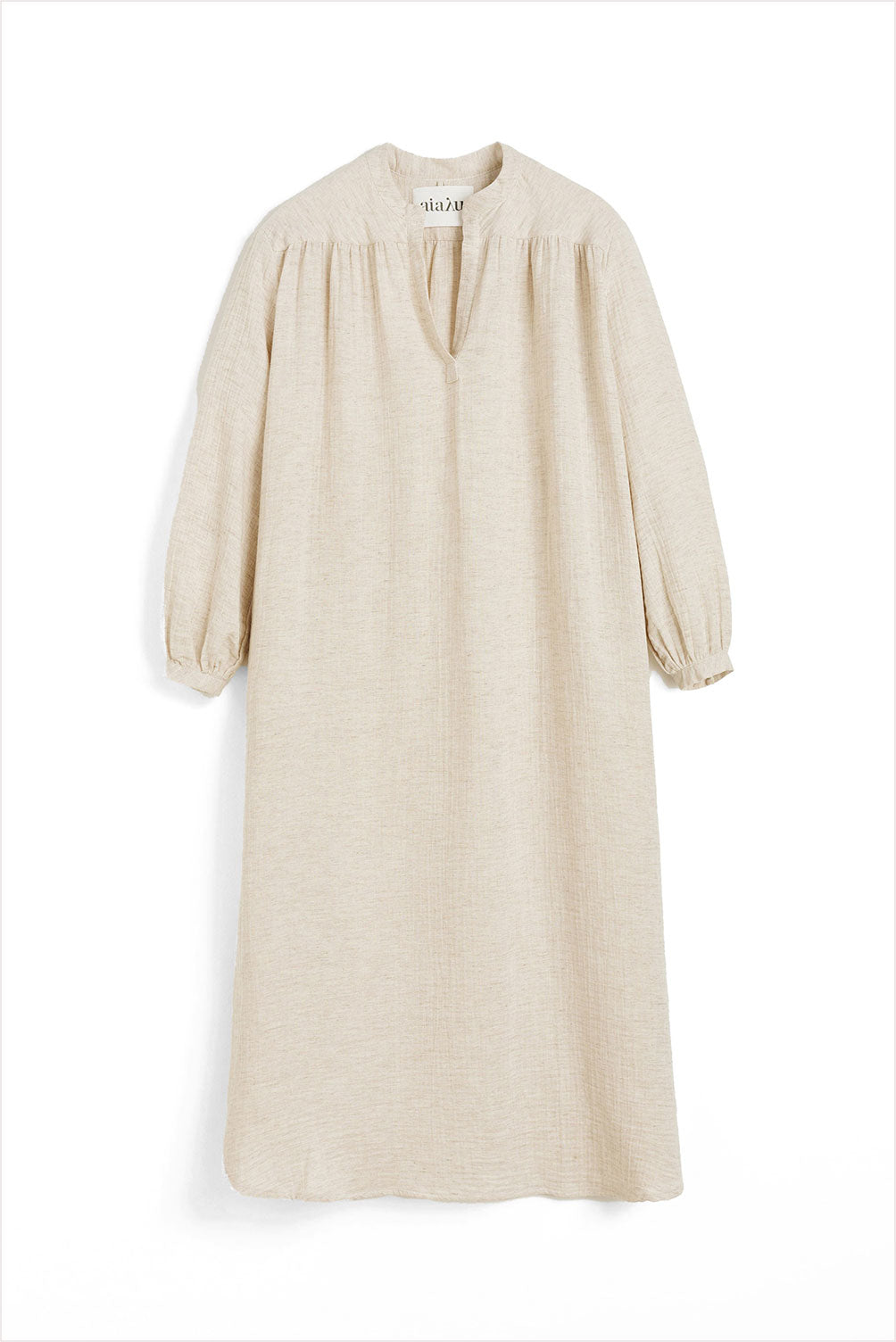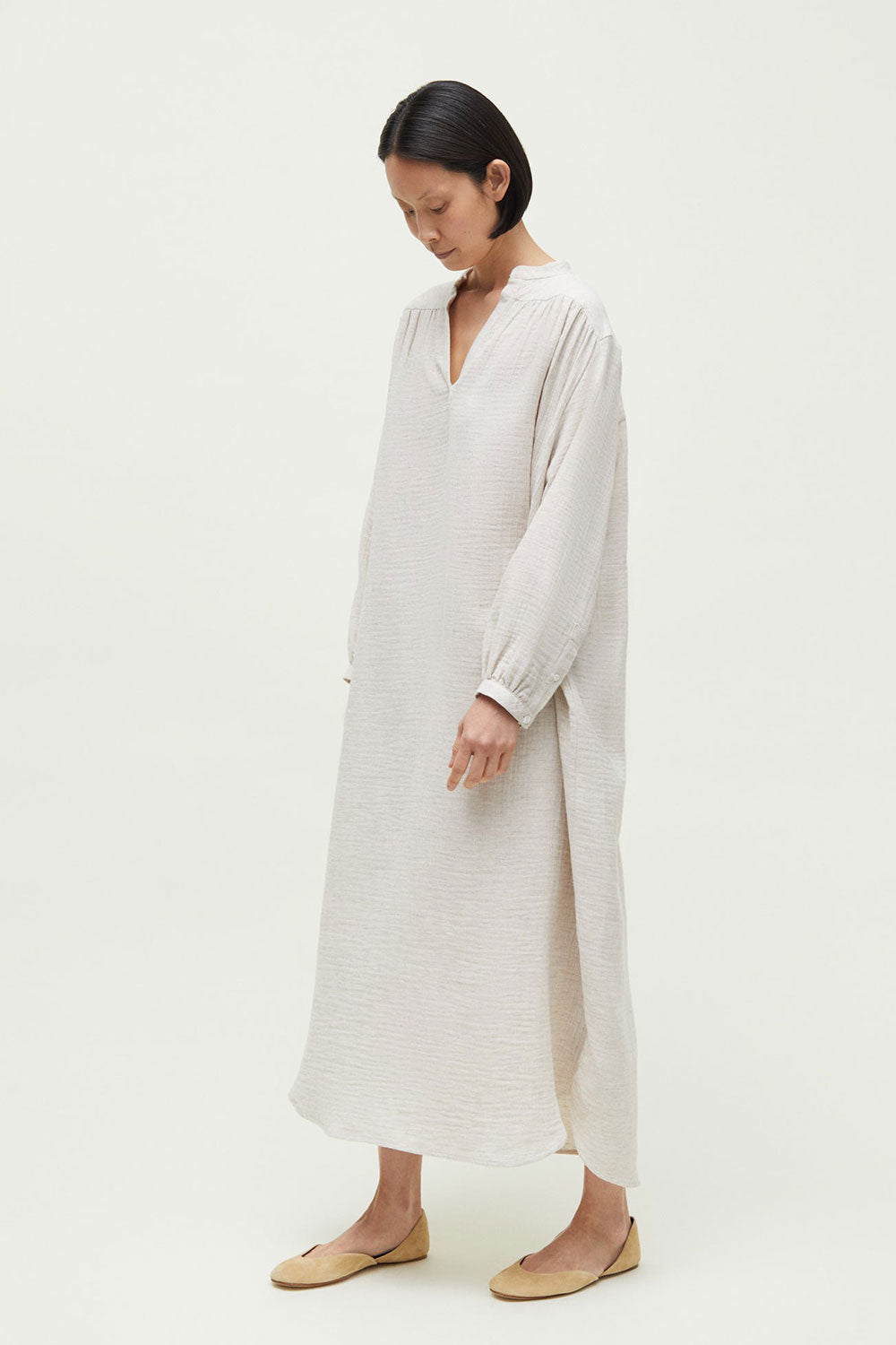 A soft, long dress made from undyed, natural fibres, creating a refined mélange effect. The dress is designed with an open neckline, a curved hemline, and delicate ruched details at the yoke and sleeves, that together form a voluminous silhouette.