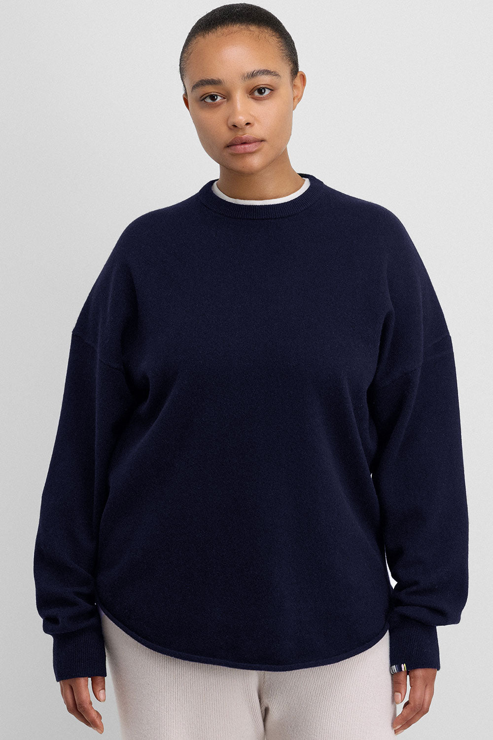 Unisex crewneck that is oversized in shape and has extra long sleeves and rounded hemlines.
