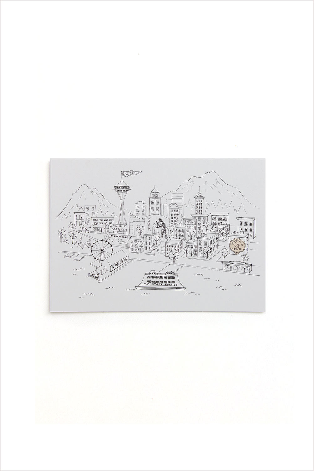 A perfect size post card for sending love and messages to your team back home from the Emerald City, Seattle, and Pacific North West. Featuring a printed design by local Seattle artist and friend of Flora and Henri, Kelly Staton. Celebrate our lovely cityscape, and new world-renowned waterfront park with timeless form of communication!