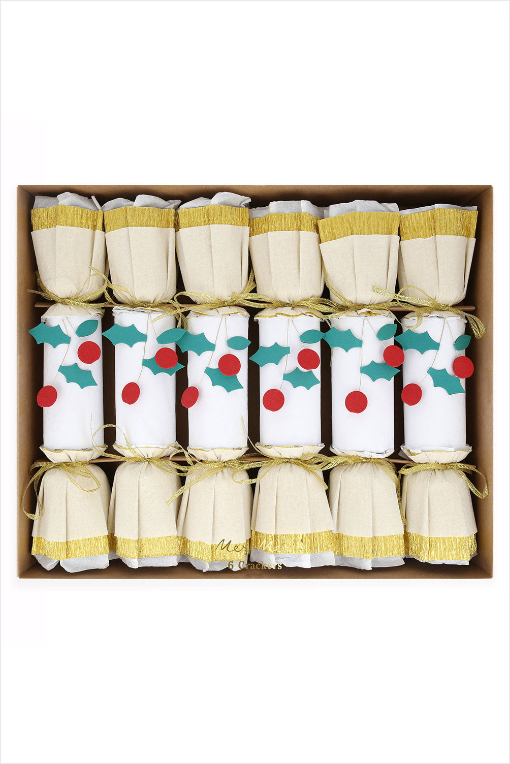 Gold ribbon bows, paper holly leaves and berries, and luxurious layers of crepe paper, make these crackers a beautiful addition to your festive table. Not only will they add a shimmering touch to your party table, but the superb contents will definitely delight your guests. Each contains a party hat, joke and a festive icon brooch – ideal as an accessory to wear year after year.