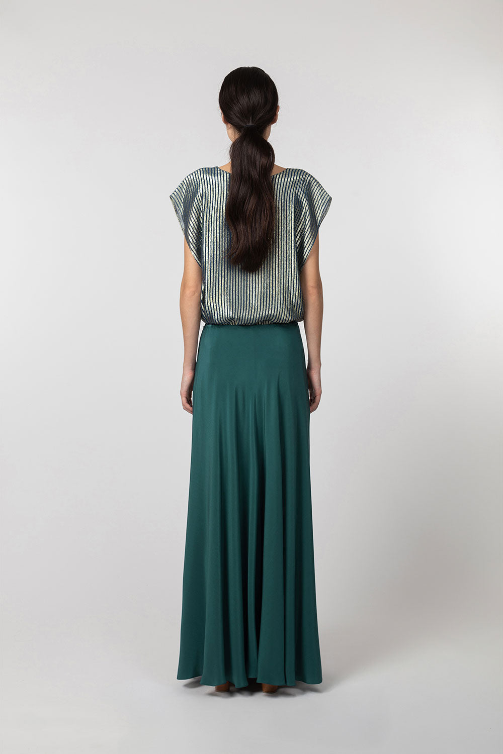 This blouse is made from a striped silk and lurex fabric woven in France by Denis & fils, a mill founded in 1956 near Lyon. The silk yarn is overdyed to create a subtle two-tone effect. The blouse, which can be worn interchangeably with a boat neck or V-neck in the front, is enhanced by its straight, pure and contemporary silhouette.