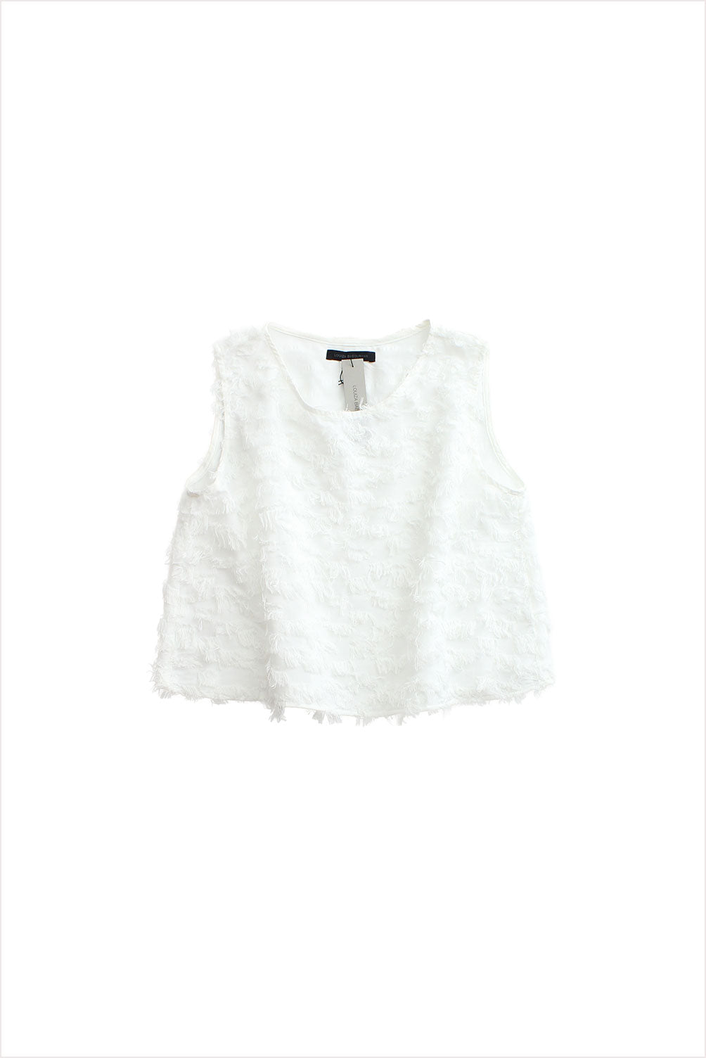 A wonderfully fun and textural option, the "eyelash" top features a cotton fringe mid-weight fabric. Unlined and opaque fabric, with round neck, open drape and sleeveless finish. Pairs beautifully with the "eyelash" skirt for a total look.