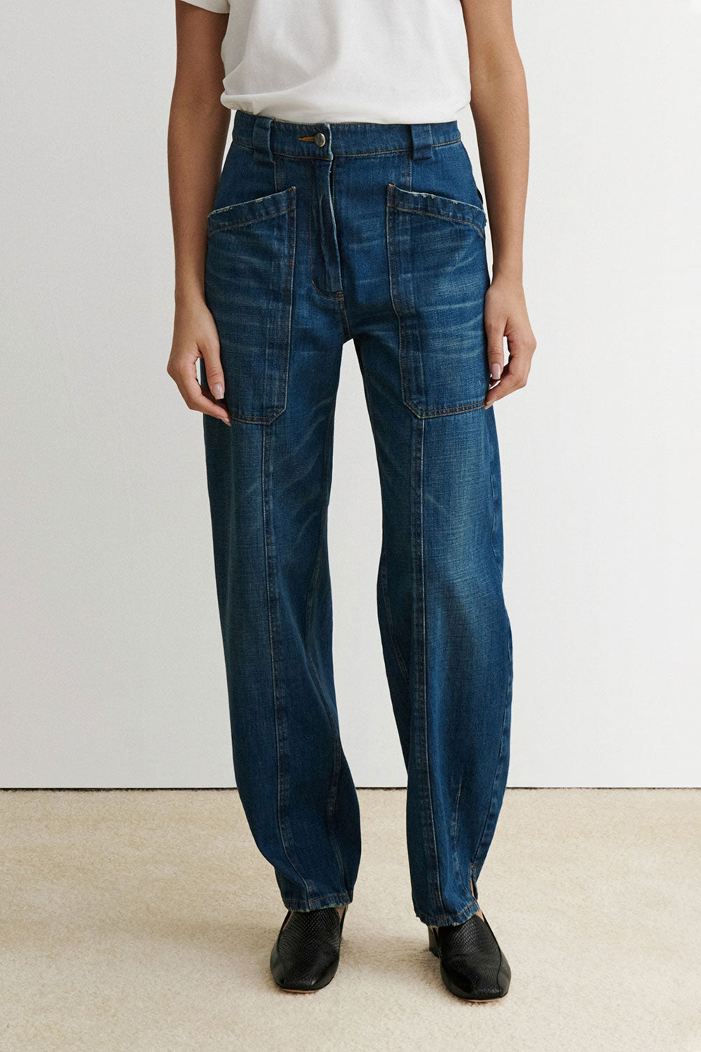 Chic carpenter pants cut in indigo Odisto Denim, featuring deep front pockets and a subtly tapered leg. Designed with front seam details, back flap pockets, and slits at the hem. Finished with a zipper and button fly closure.