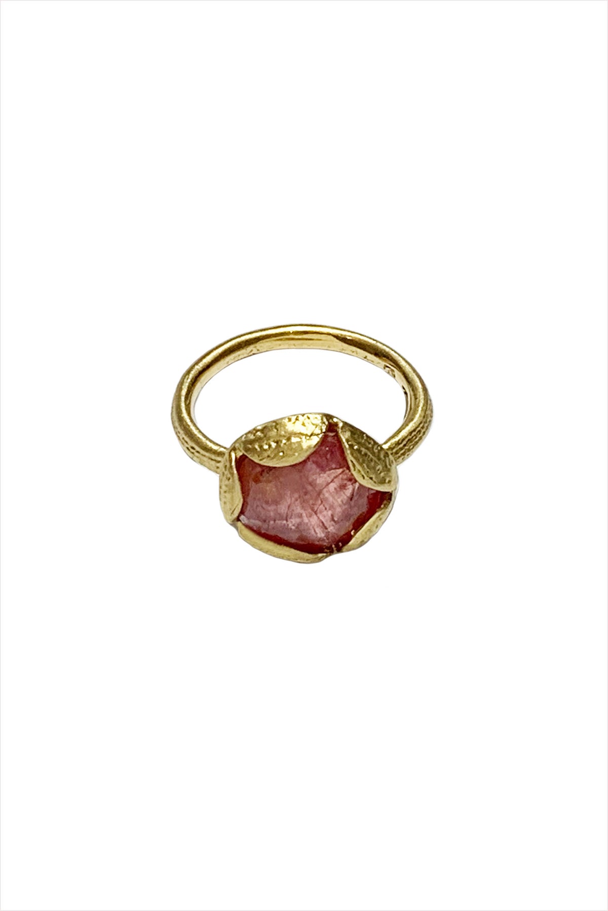 Elegant and striking, this 18k yellow gold ring is adorned with a beautiful rose cut pink sapphire.